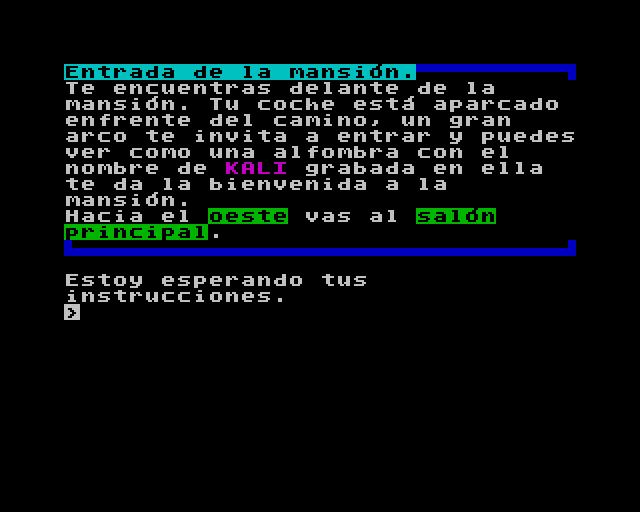 "Mansión Kali II" es el port para ZX Spectrum de la aventura conversacional del mismo título realizada por el equipo de Commodore Plus para Commodore 64.